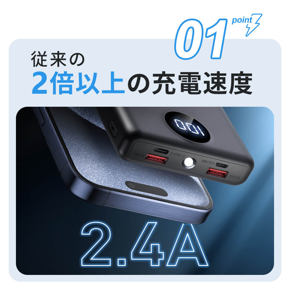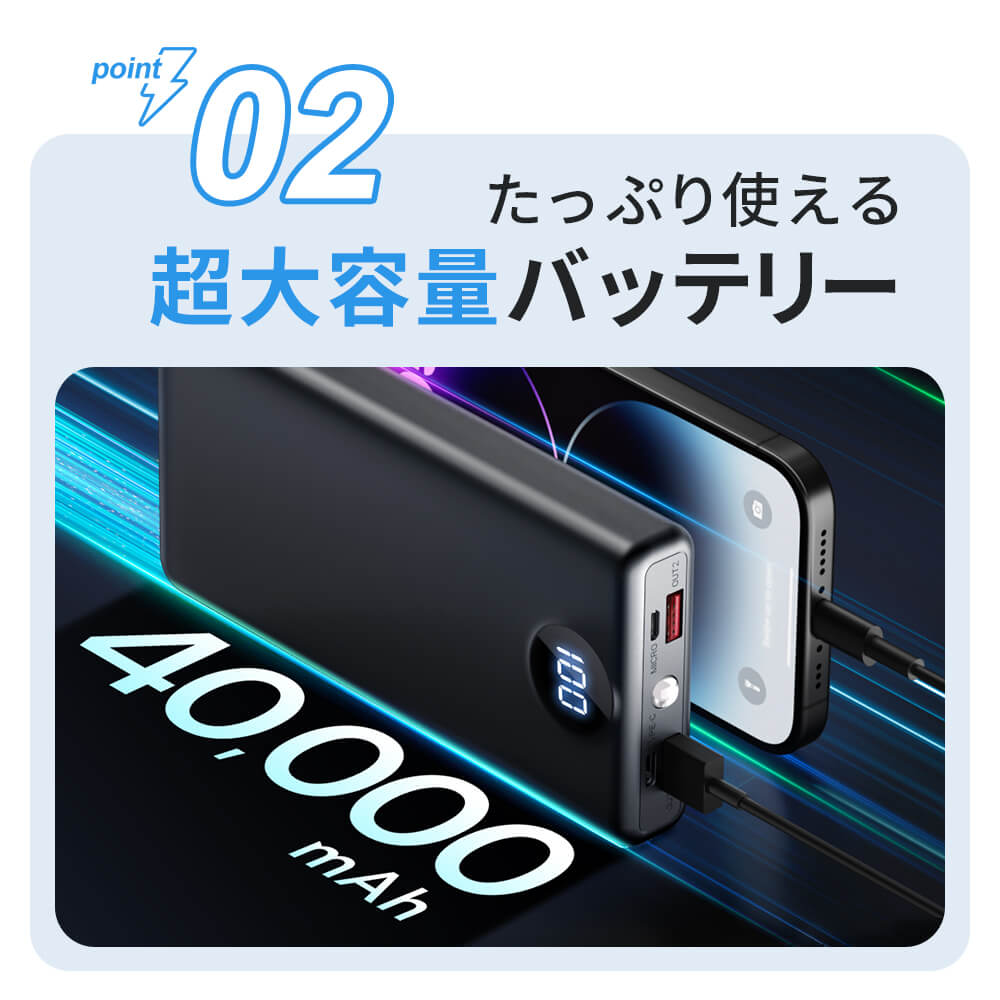 【40000mAh大容量モバイルバッテリー&2.4A急速充電】外出先でスマートフォンやタレットなどのを安心して使いたい方にとって、モパイルバッテリーは必需品です。弊社製モパイルバッテリーは40000mAh大容量を備え、従来の2倍以上の充電速度、iPhone15に約8.75回充電可能です。携帯しやすく、短期の出張や旅行に適しています。また、台風や地震などの緊急時には予備電源としても使用できます。