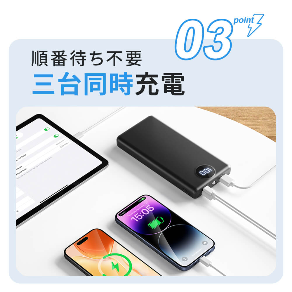 【3台同時充電可能&LED残量表示】出力にはUSB—Aポートx2.USB—Cポートx1、3台同時充電可能です。LED電量表示が搭載されており、残りの電量を簡単に確認できるため、予期しない電源切れを防ぐことができます。